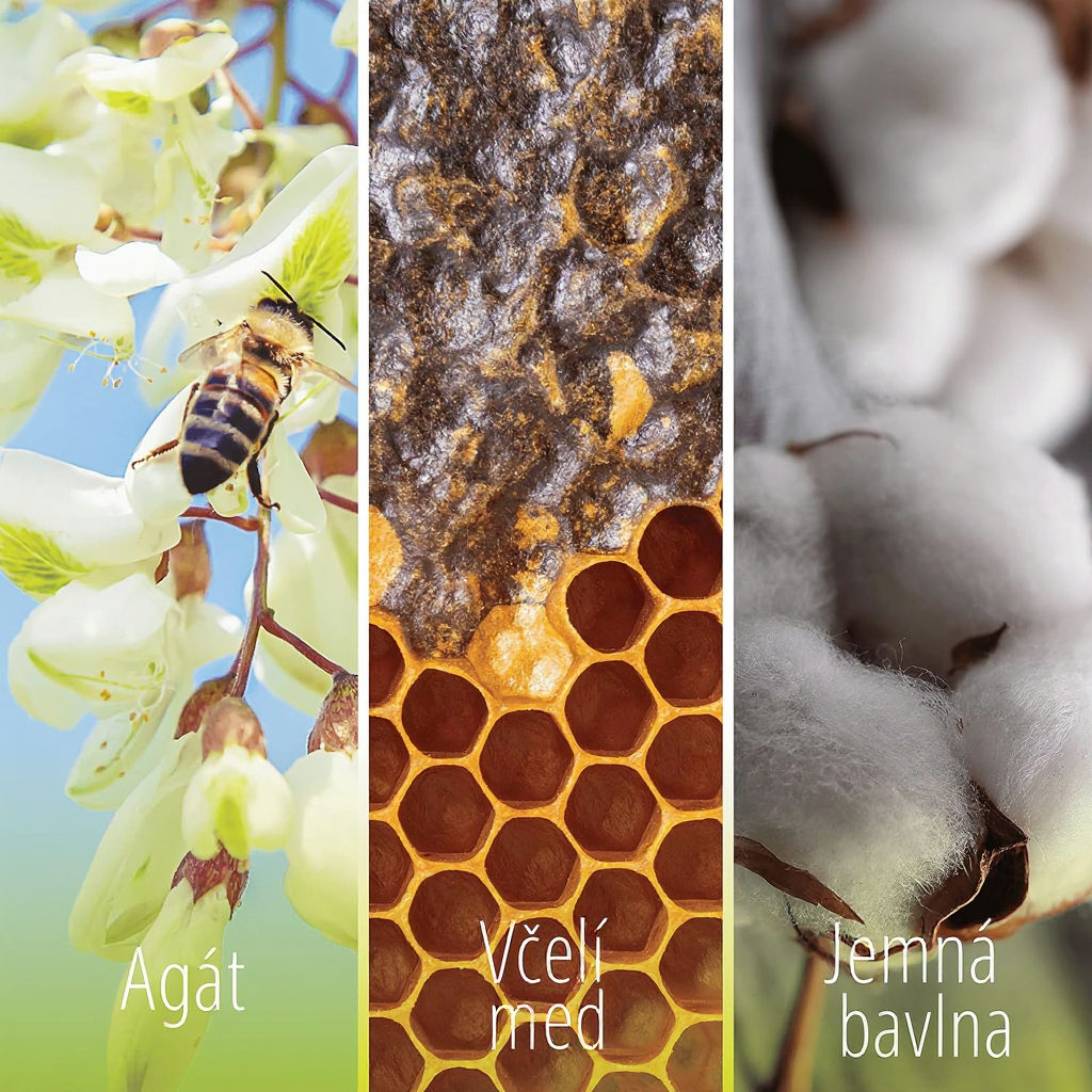 Agát je strom s hlbokými kultúrnymi a mytologickými koreňmi, ktorý sa vyskytuje po celom svete, najmä v Austrálii. Má významné miesto v egyptskej a židovsko-kresťanskej histórii, kde bol považovaný za posvätný symbol ochrany a večnosti. Vôňa agátu je jemná, no zároveň výrazná a upokojujúca. - Včelí med – sladká a hrejivá esencia, ktorá dodáva vôni hebkosť, útulnosť a jemný dotyk prírody.