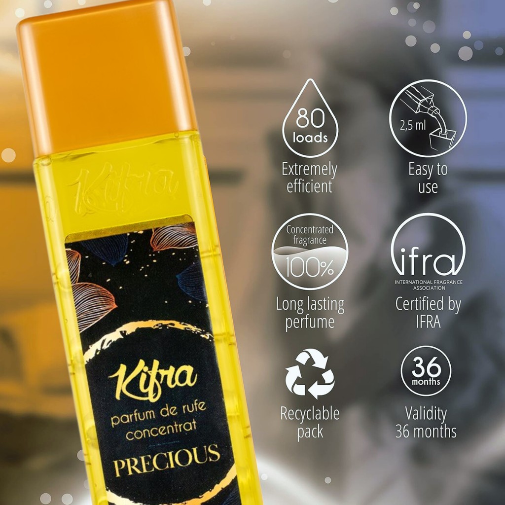 Kifra Precious je parfum na pranie, ktorý nahrádza bežnú aviváž. Je vyrobený na báze vonných olejov, vďaka čomu je jeho vôňa intenzívna a dlhotrvajúca – vydrží aj po použití sušičky. Na rozdiel od bežných aviváží stačí malé množstvo na dosiahnutie silnej vône. Po vypraní bude sviežo voňať nielen bielizeň, ale aj váš domov. Dávkovanie: Parfum nalejte do priehradky na aviváž v množstve 2,5 ml na jednu dávku prania. Pozor! Produkt je určený výhradne na použitie v práčke. Ak sa dostane na iný povrch, okamžite ho zotrite vlhkou handričkou, prípadne opláchnite vodou. Zloženie: Obsahuje (5-<10%): 4-tert.butylcyclohexyl acetát, 2-hexyl-3-fenyl-2-propenal (trans/cis), 2,6-dimetyl-7-okten-2-ol, hexyl 2-hydroxybenzoát; (2,5 – <5%): 2-(4-tercbutylbenzyl) propionaldehyd, 2,2,2-trichloro-1-fenyletyl acetát , 3a,4,5,6,7,7a-hexahydro-4,7-metano-1H-indén-5(6)-yl propanoát , 2-ter.butylcyclohexyl acetát, benzylacetát; (1-<2,5%): 1-(2,6,6-trimethlcyklohex-2-én-1-yl)pent-1-én-3-ón (metyl-jonón (zmes izomérov)), 1-(1,2,3,4,5,6,7,8-oktahydro-2,3,8,8-tetrametyl-2-naftyl)etán-1-ón (OTNE), 4,6,6,7,8,8-hexametyl-1,3,4,6,7,8-hexahydroindeno [5,6-c]pyrán galaxolid (HHCB), 4-metoxybenzaldehyd; (1 - <5%): 2 H-1-benzopyran-2-ón, 2-fenyletanol; (0,25 – <1%): (R)-p-menta-1,8-dién, 2-methylundekanál, (0,1-<1%): metyl 3-fenyl-2-propenoát, izoeugenol, 2,2-dimetyl-3-(4(2)-etylfenyl)propanál, allyl 3-cyclohexylpropionát, 2-methoxy-4-propylfenol, 10-undecenal, dodekanal. Nebezpečenstvo! H315 Dráždi kožu. H317 Môže vyvolať alergickú kožnú reakciu. H319 Spôsobuje vážne podráždenie očí. H360Fd Môže spôsobiť poškodenie plodnosti. Podozrenie, že spôsobuje poškodenie plodnosti alebo nenarodeného dieťaťa. H411 Toxický pre vodné organizmy, s dlhodobými účinkami. Uchovávajte mimo dosahu detí a pred použitím si prečítajte etiketu. Pri podráždení pokožky alebo výskyte vyrážok vyhľadajte lekársku pomoc. Prázdny obal zlikvidujte podľa predpisov.